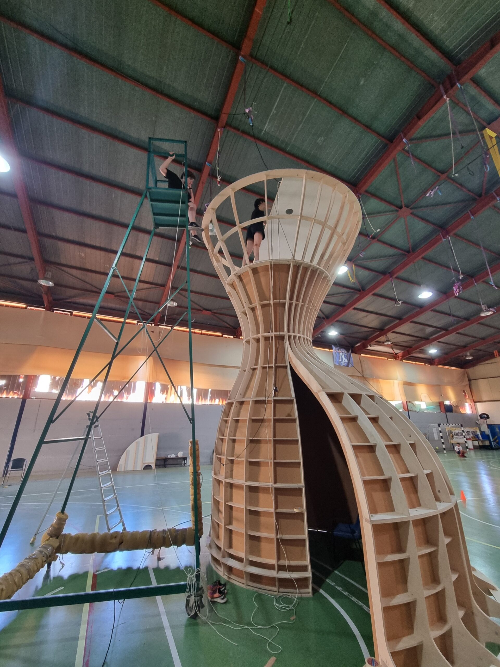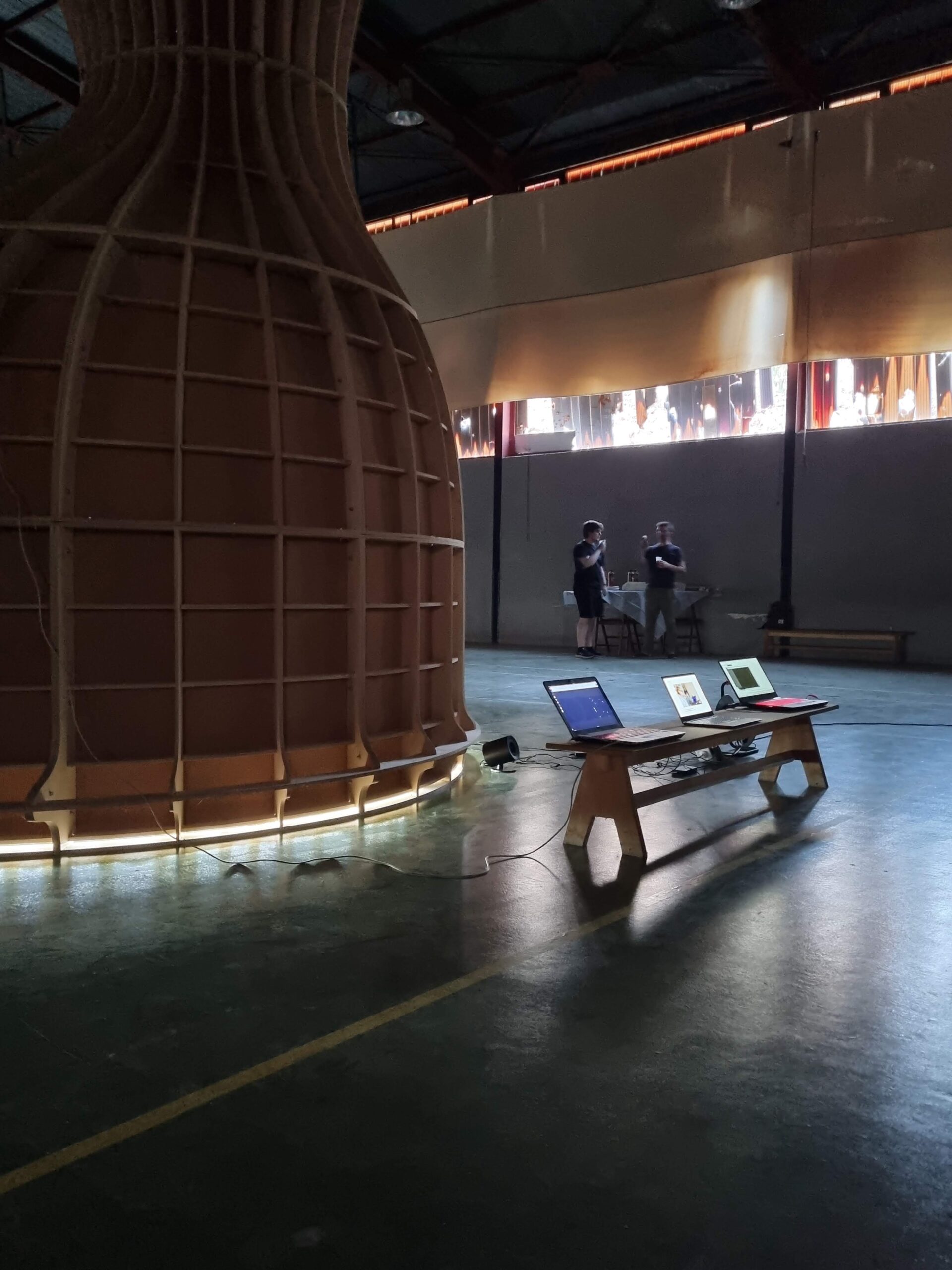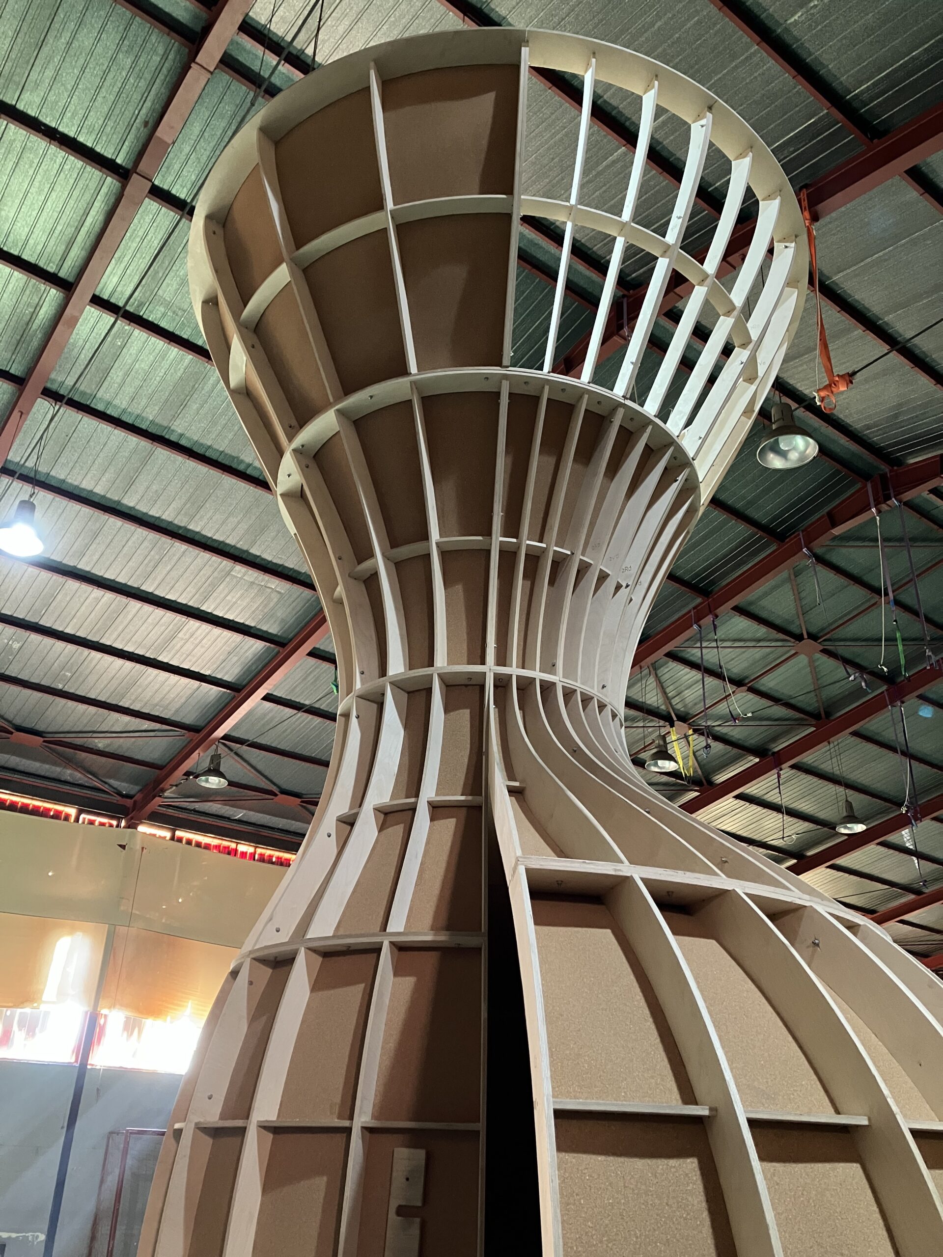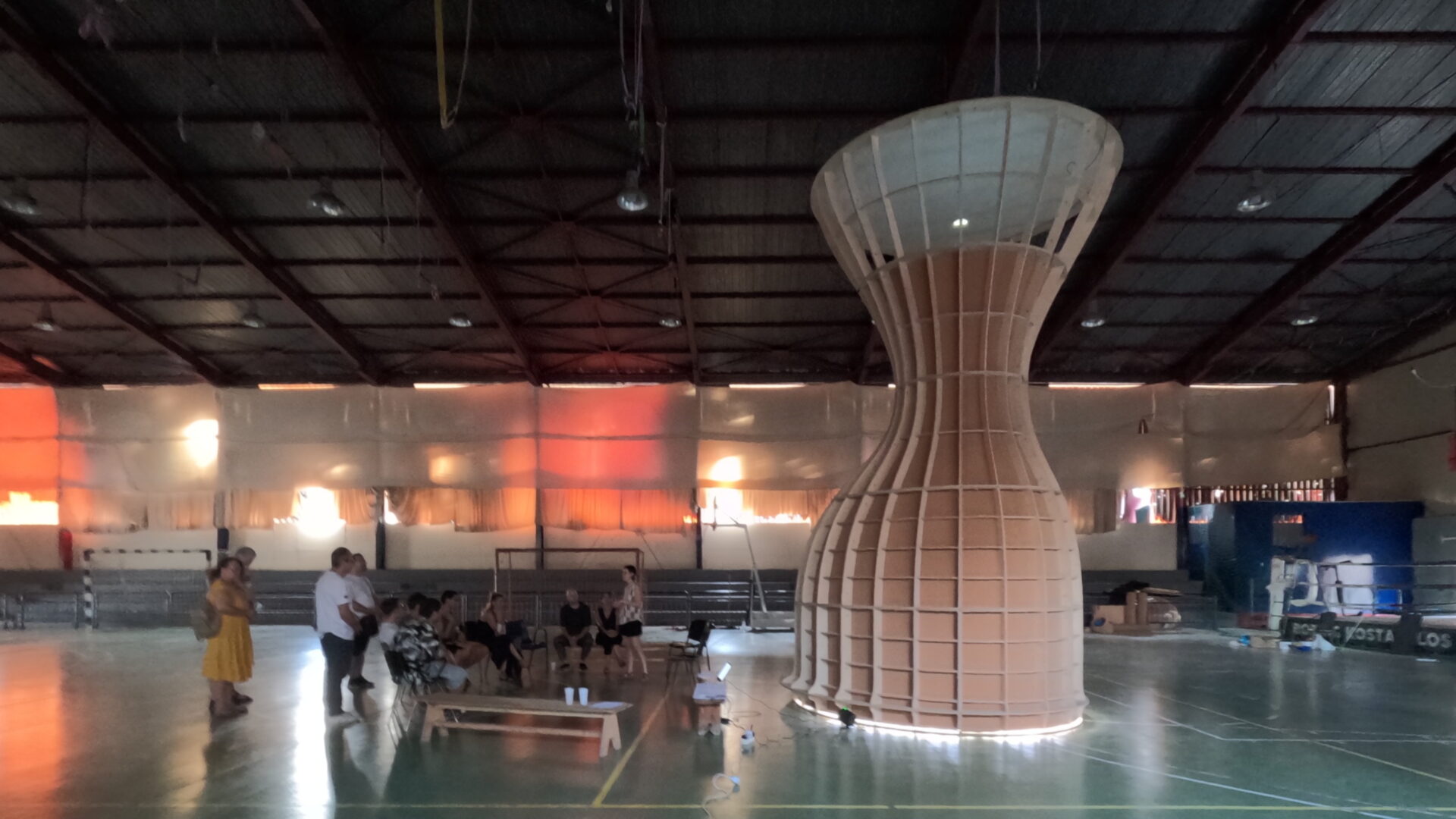 “Echoes” is a physical space with dimensions of approximately 4,5 meters curvilinear base, and 6 meters in height, constructed with eco-friendly materials. It is a parametrically designed structure made of interlocking 15mm wood pieces cut using CNC precision and coded for easy assembly. These interlocked pieces shape 40 frames of various shapes and dimensions that are mounted next to and on top of each other. The structure is designed for rapid and efficient assembly and disassembly, and with transportability in mind for deployment in various contexts. The frames are clad with two 8 mm-thick layers of cork that seamlessly mold to the complex curvatures of the frames. The cork layers also provide acoustical protection and contribute to the desired sound reverberation. The inner surfaces are dressed with cork fabric for tactile considerations and visual continuity.  The top part of the installation creates a protective cap that also serves as the carrier of all equipment, hidden from the visitor’s eye. The bottom surface of this cap is white to reflect the dynamic lights that are projected by a short-throw projector mounted on it. The projector projects dynamic light events on a 1.60 meters milky half-spherical plexiglass with a 160 cm diameter that, from the interior, is perceived as a dome. This surface is positioned 1.20m below the cap and approximately 4.50m above the ground.