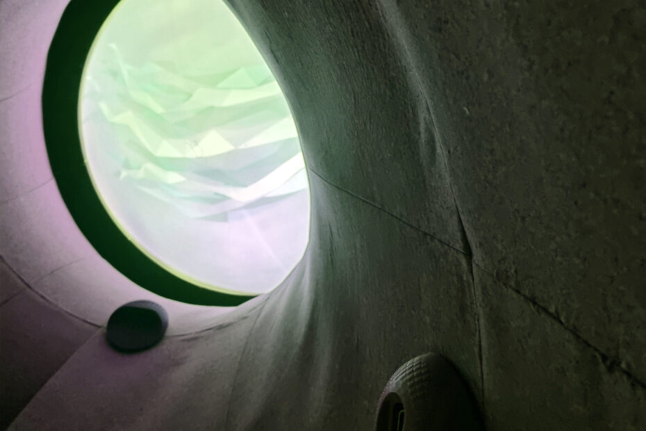 Autistic individuals frequently seek smaller, sensory-friendly spaces to help them self-regulate. The installation’s curvilinear, nature-inspired geometry creates a smooth transition entry zone from a larger space to an intimate curvilinear interior. Its geometric composition, material, light, acoustics, and overall detailing follow evidence-based research to provide a personalized, sensory-friendly, and soothing experience. The installation is organized in three interconnected environments: In “outside: a collective experience,” participants engage with “Echoes” while they approach it from an exposed environment initially through its totem-like scale and playful geometry, and also with a series of light events that emerge from within and change slowly and dynamically in light intensity and coloration. This infrastructure acts somewhat as a faro/lighthouse that invites people closer. Participants then enter its intimate, interior space that functions as a “retreat” for an individual, dynamically adjusting the light and its sonic qualities based on their movement and breathing rhythms. Movements like rocking, vocalizing, or fidgeting are often misunderstood—but they’re essential forms of self-expression. Participants are encouraged to interact with a dynamic projection, “the self-reflecting moon,” that echoes their presence, encouraging self-awareness and playfulness, as a soothing process.