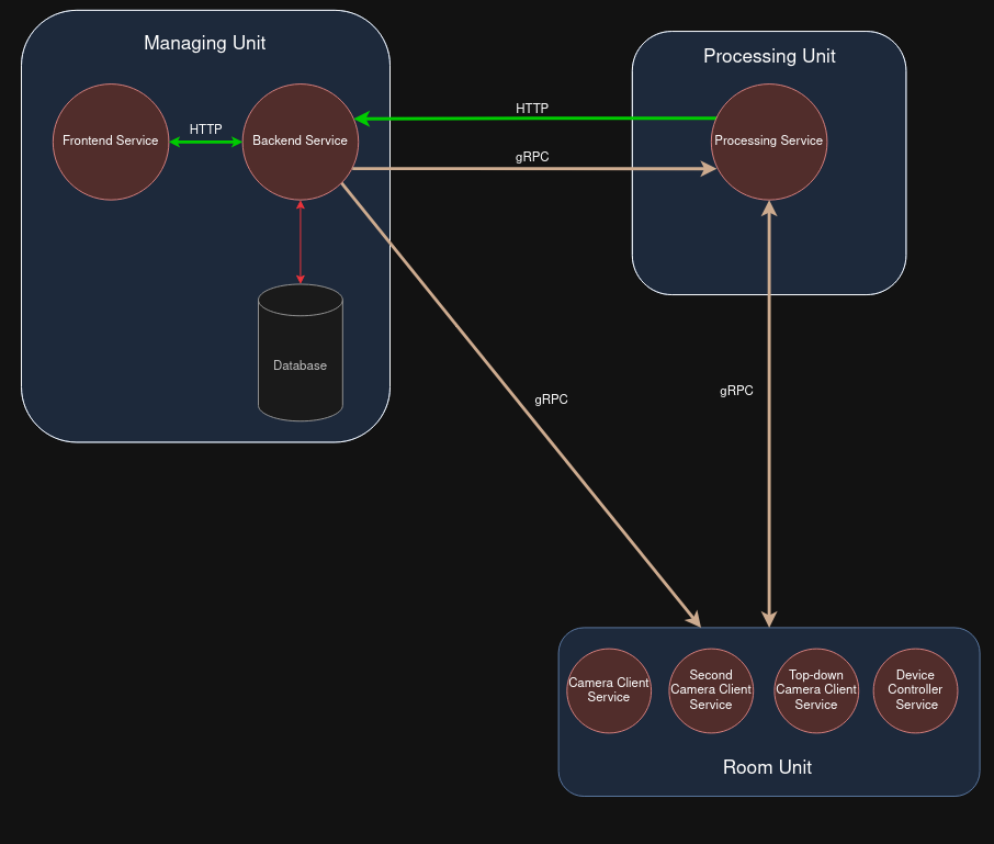 – Room Unit: Composition of processes that interface with the physical installation. They handle capturing inputs from cameras and mmWave sensors to forward to the processing unit using gRPC streaming. They also handle the outputs of the processing unit, which they forward to the projector, LED strips, and other interactive devices.