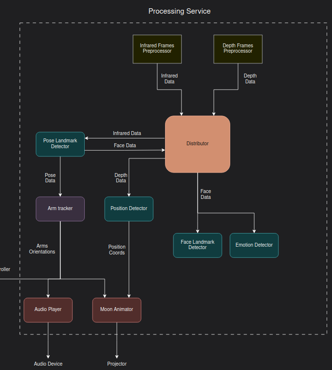 – Processing Unit: It receives input from different sources (camera, mmWave sensors) and distributes it to the appropriate detection modules depending on the source. These, in turn, forward their outputs to other modules that translate the detections to the interactive media or logic of the room (moon animation, audio, lights)