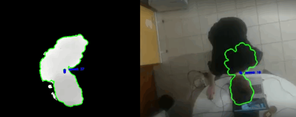 – Position Tracking: For position tracking, a custom solution was implemented using the OpenCV library with an overhead depth camera. The adopted approach uses the depth frame from the camera above, applies a distance cutoff to remove the floor from the depth data, and then applies a mask to hide parts of the room (like walls) that are static in the frame (since the shape of the room is known). That way, when someone enters the room, they are the only tall enough object to appear in the depth data, and after applying the filtering methods, clustering can be performed to obtain the shape of the object and determine the position of the person in the room.