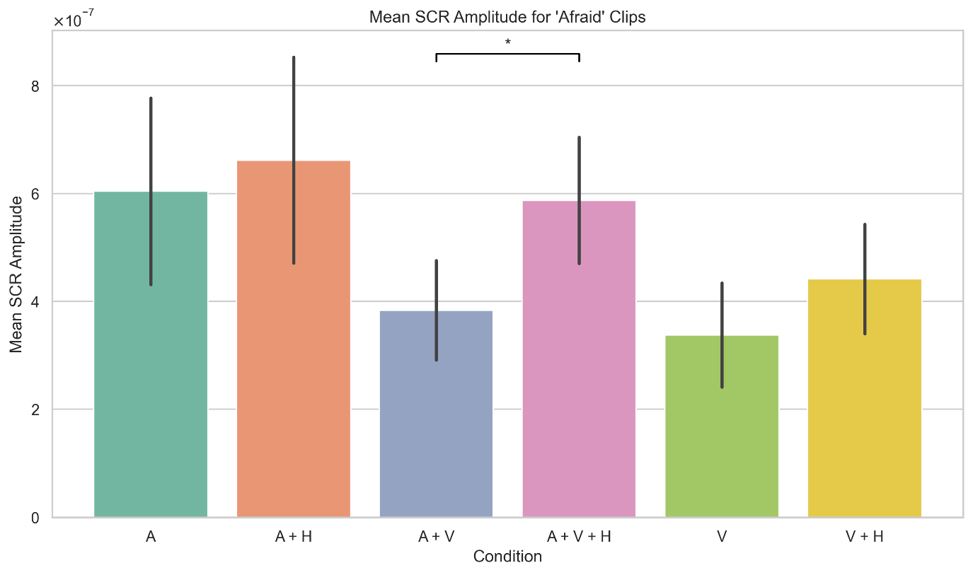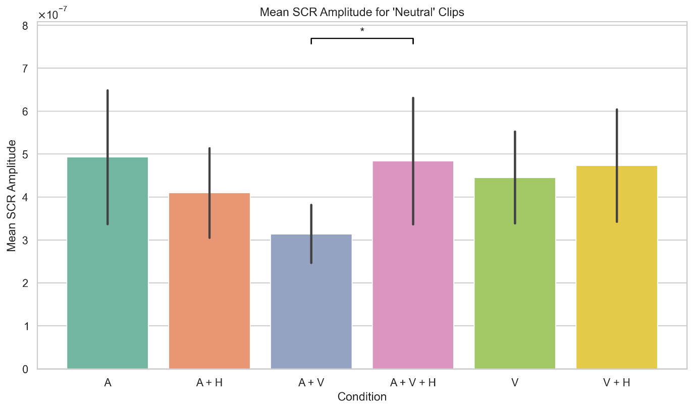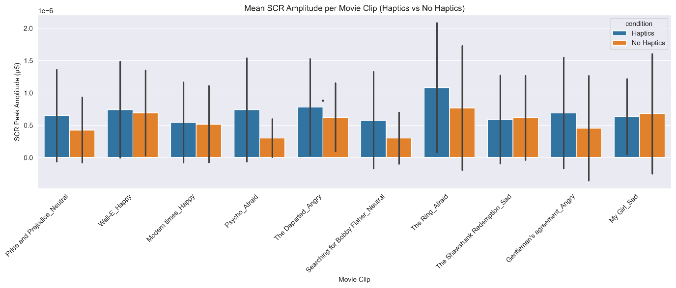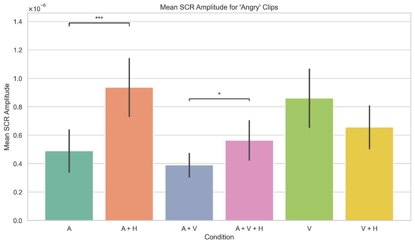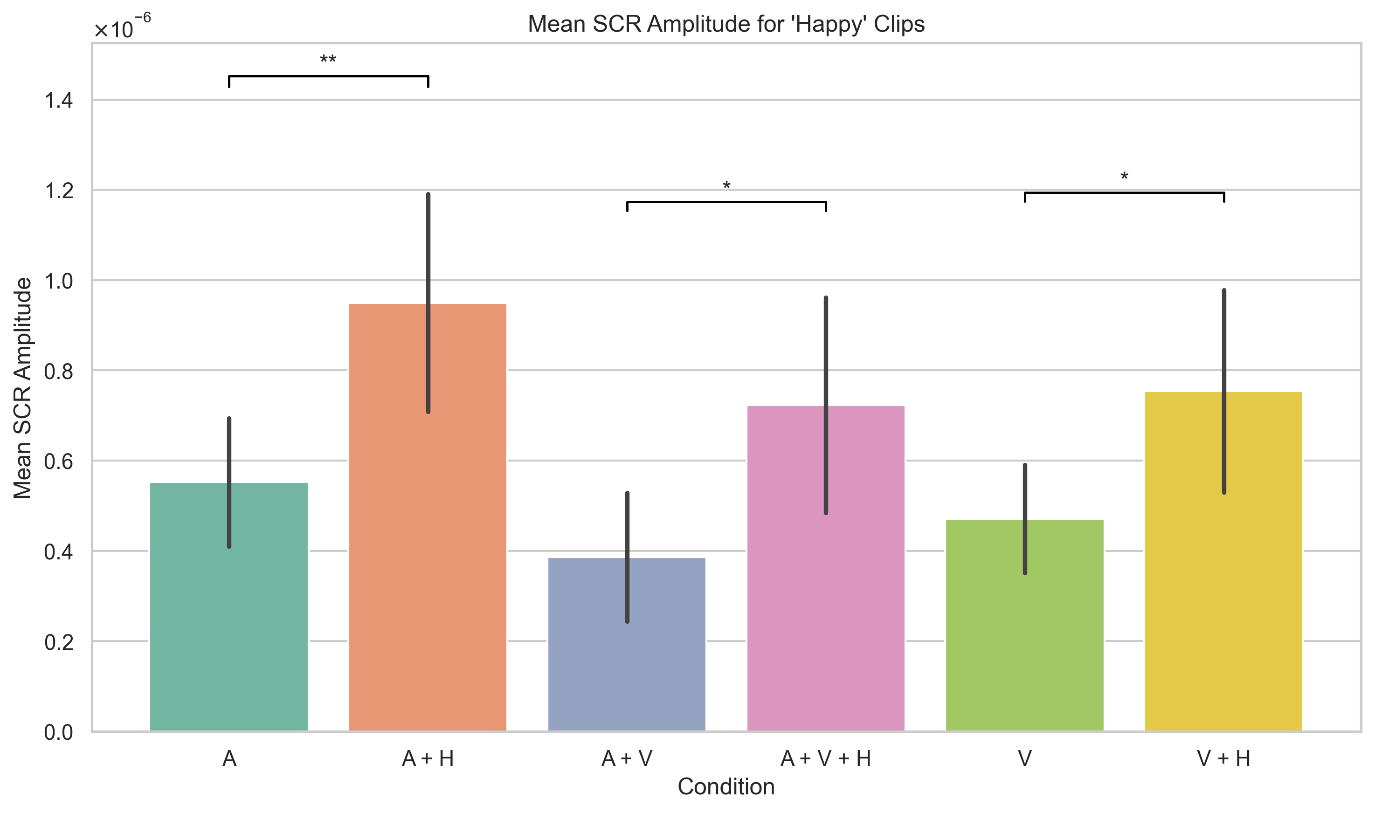 When audio and video were combined, the addition of haptic feedback led to higher skin conductance responses across all emotions. For the longer film clips taken from feature films, haptic stimulation generally increased perceived arousal, though this effect was not consistent across all clips, and a statistically significant increase in skin conductance was observed in only one case. For the shorter clips, adding haptic feedback reduced reported arousal, but only for anger and fear. However, across all emotions, combining haptics with audio and video consistently resulted in higher skin conductance responses. Notably, for happy clips, adding haptics increased skin conductance in the audio + video, audio-only, and video-only conditions.