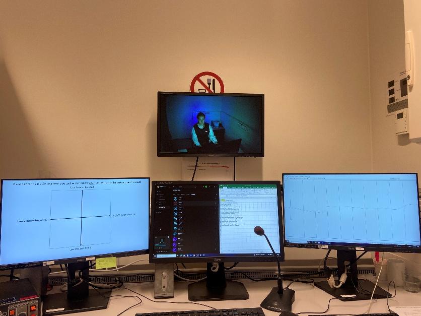 Participants viewed film clips either with or without haptic feedback and, after each trial, rated their experience in terms of perceived valence and arousal. Short clips were presented under six conditions: audio only, video only, audio + haptics, video + haptics, audio + video, and audio + video + haptics. Throughout the experiment, physiological arousal was measured using skin conductance recorded via two electrodes attached to the fingers of the left hand.