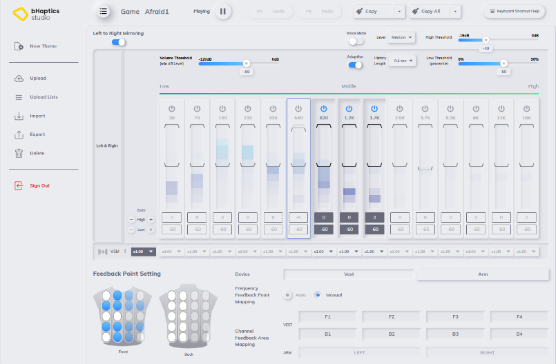 Receives haptic signals from supported games, applications, or custom software and plays them on the vest in real time. (there are some existing profiles loaded). - Audio-to-Haptics Mode: