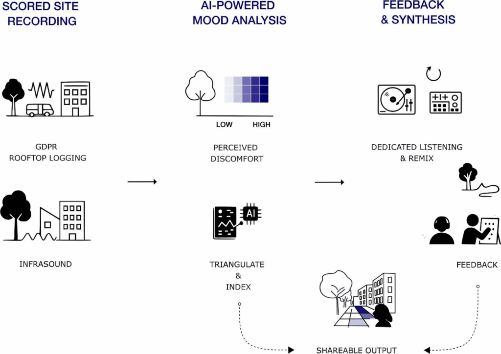 CDA Sonic Drift is an art- and data-driven experiment that uses a Score—a geocoded choreography of capture times (sunrise, sunset, midnight) and positions (Garden, Avenue & Street | Rooftop & Sidewalk)—to sample a mixed-use block under compact-city pressure. Sonic walks record near-field textures, including infra-sound; GDPR-compliant rooftop logging tracks the broader acoustic horizon. An AI pipeline (AER + USS), co – created with the ReSilence team of CERTH, reads the material, and a GIS layer visualises Sonic Space Shifts: affective changes in the urban soundscape that flag quality-of-life transitions. Challenges addressed — (1) Site recording capturing sonic and infrasonic data GDPR-compliantly; (2) translating sensory findings into qualitative and quantitative descriptions of sonic space shifts and planners, designers and inhabitants find credible; (3) art-driven integration of participatory listening with data-driven tools. Urban dimension — The Chaussée d’Anvers block (Brussels North) typifies heritage old industrial port landscapes, affective car driving and scarce greenspace. Sonic comfort grids, following the drift score, expose trade-offs between densification, mobility corridors and acoustic well-being.
